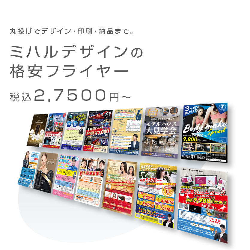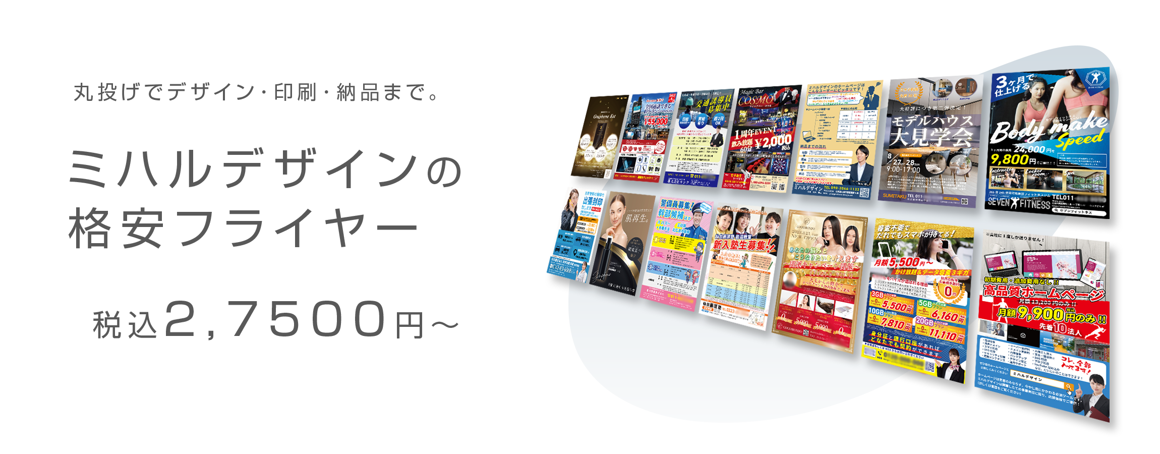 当社のチラシ・フライヤーは「早い・安い・上質」がモットーです。片面27,500円(税込)~で文章や画像などの準備が不要で丸投げもOK!お客様からの要望・条件をお聞きし、最良のデザインを1週間以内にご提供致します。